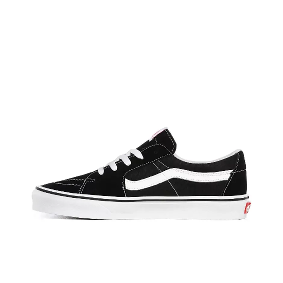 To identify the authenticity of the Sk8 Vans-Low 'Black White', examine the stitching and overall craftsmanship. Authentic pairs feature precise stitching with no loose threads, and the logo should be clear and well-defined. The color should be consistent, with a rich black hue and contrasting white accents. Check the sole for proper branding and ensure the rubber is of high quality, providing durability and grip.