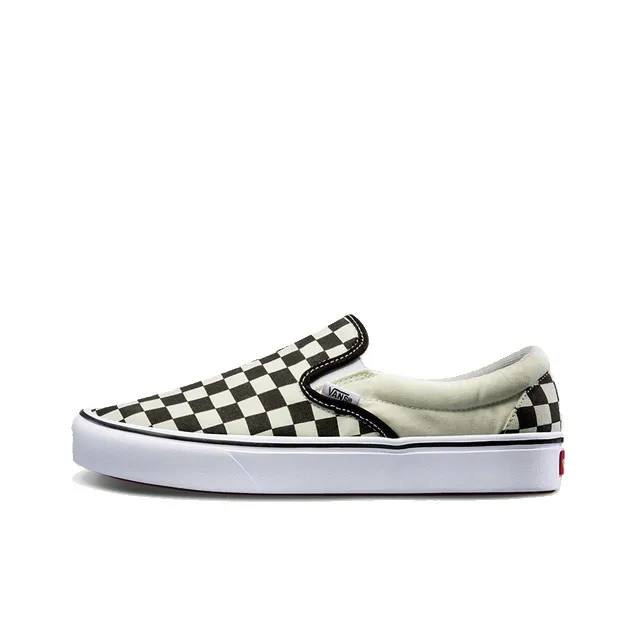 To verify the authenticity of the Vans ComfyCush Slip On 'Checkerboard', check the quality of the canvas and the precision of the checkerboard pattern. Authentic pairs will have a smooth finish with no imperfections, and the pattern should be perfectly aligned without any misprints.
