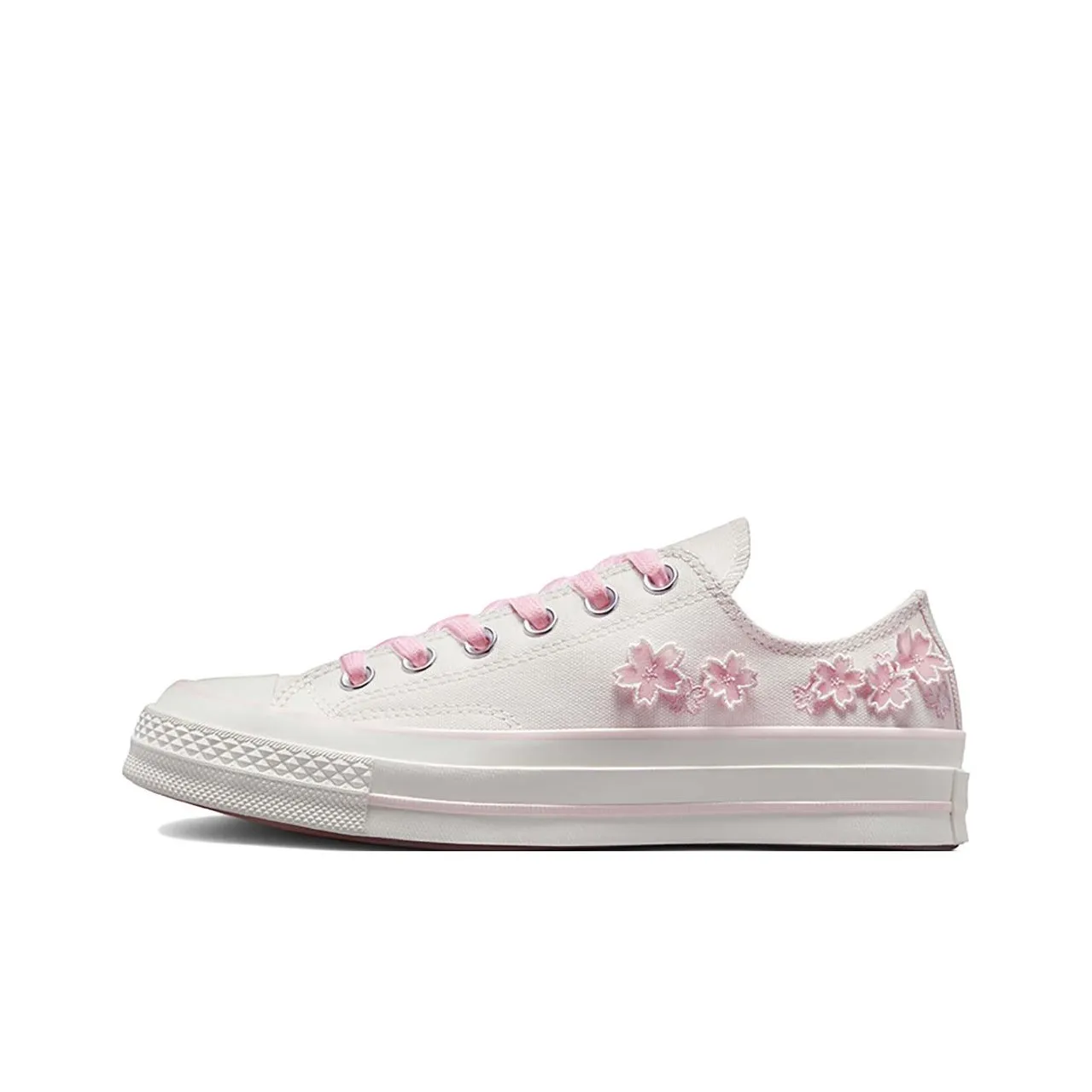 To verify the authenticity of the Converse Chuck Taylor All Star 1970s 'Blossom Vintage', inspect the overall design and color scheme. The canvas should be pristine, and the pink accents should be sharp and well-defined. The sole should be flat, characteristic of the 1970s model, and the stitching should be even and tight.