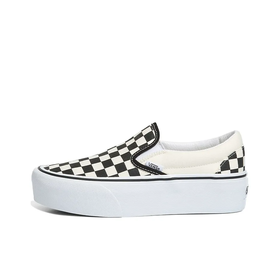For the Slip-On Classic Vans Stackform 'Checkerboard - Black White', check the fabric quality and the precision of the checkerboard pattern. Authentic Vans will have a smooth finish with no irregularities in the fabric. The sole should be thick and provide good grip, with the Vans logo embossed.