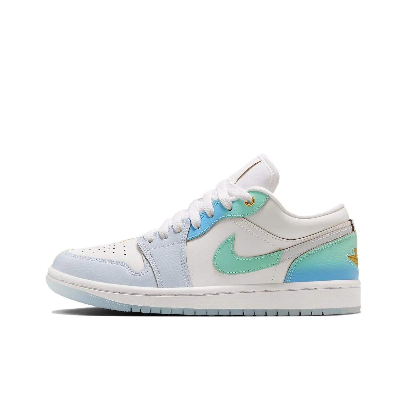 For the Air Jordan 1 Low SE 'Emerald Rise' Women's, inspect the white and blue color scheme. Authentic pairs will have a consistent color application, and the materials should feel high-quality. Look for any signs of poor craftsmanship, such as uneven edges or misaligned logos.