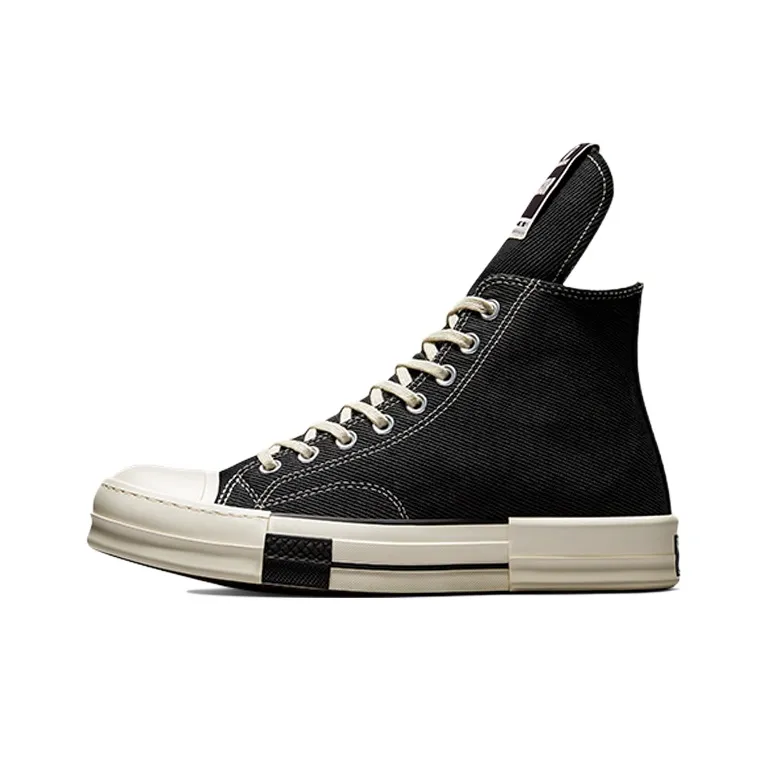 For the Chuck 70 Rick Owens x Chuck 70 Drkshdw Drkstar Converse High 'Black', check the high-top design for quality. Authentic pairs will have a sturdy construction with no loose threads. The rubber sole should be flexible, and the overall appearance should reflect the original design.