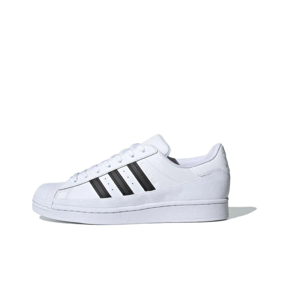 For the Adidas Superstar Mg Cloud White Women's shoes, inspect the overall appearance closely. Authentic pairs will feature a smooth, high-quality leather upper with a consistent white color. The toe cap should be shiny and well-formed, with no scuffs or imperfections. The black accents should be sharp and distinct, maintaining the classic Adidas look.