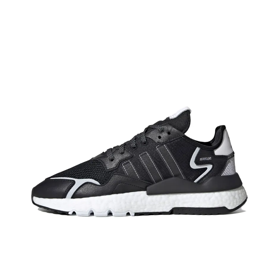 Inspect the overall look of the Adidas Nite Jogger 'Black White'. Genuine joggers have a sleek design with a polished finish. The color should be uniform, and the logo must be prominently displayed without any smudging.