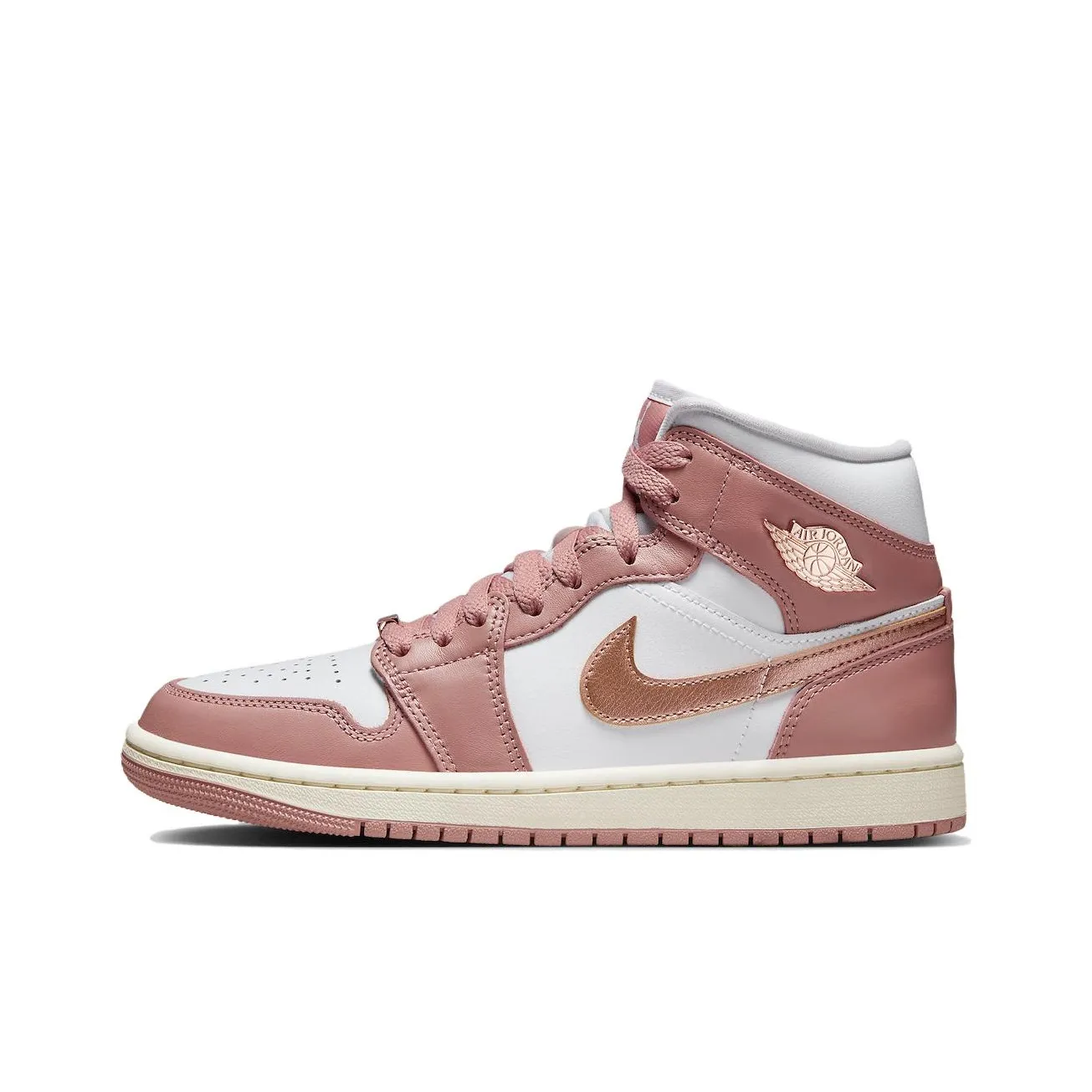 For the Jordan 1 Mid Se Red Stardust Women's shoes, check the synthetic leather for quality and consistency. Authentic pairs will have a smooth texture and vibrant pink color. The stitching should be even, and the overall design should reflect the official style.