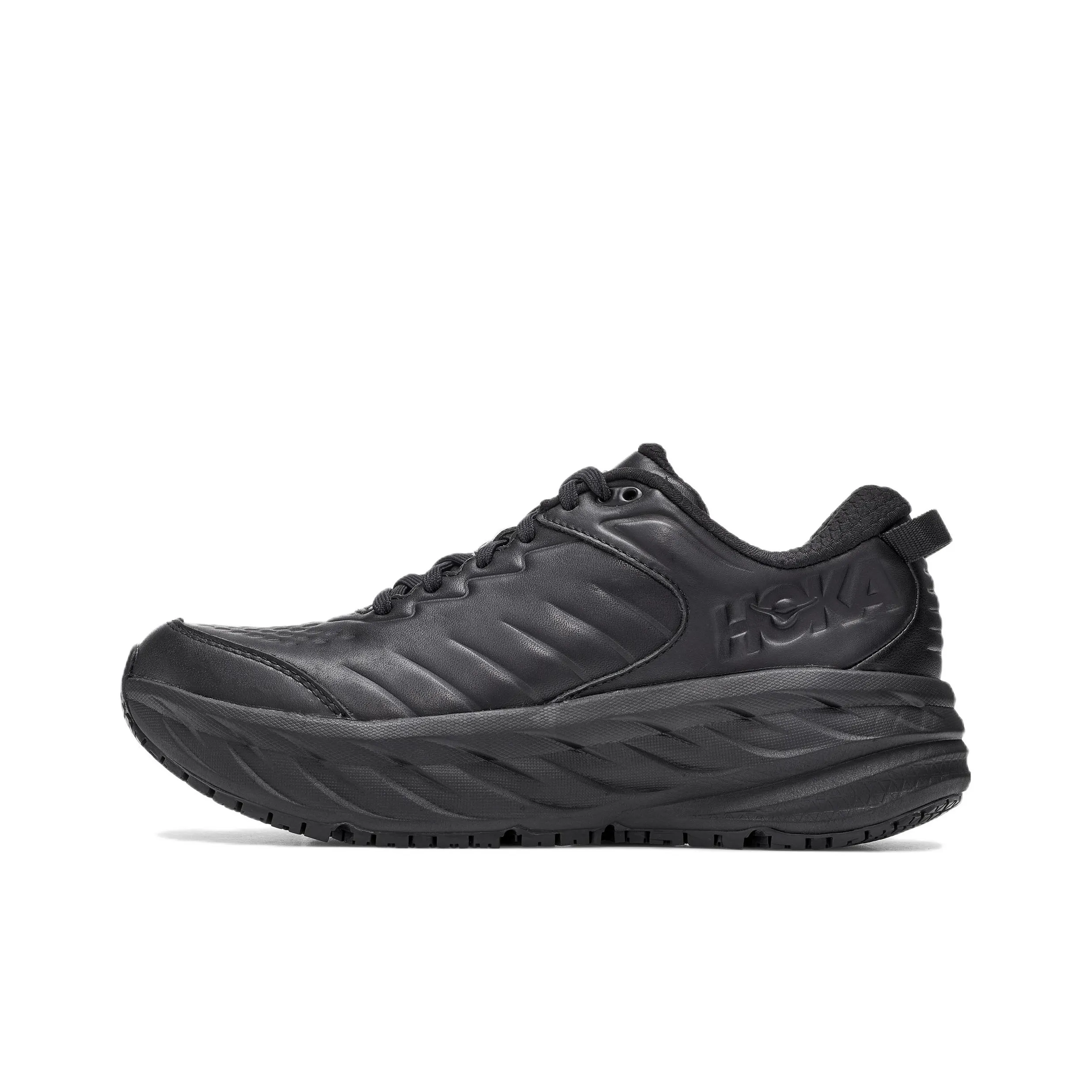 For the HOKA ONE ONE Bondi Sr, inspect the overall finish and material quality. Authentic pairs will have a smooth leather upper with no imperfections. The color should be a deep, consistent black, and the sole should exhibit the brand's signature cushioning technology without any irregularities.